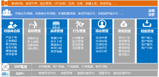 行为管理:借助移动终端,实现对市场人员行为、日报、巡店进行全方位管理,并能过移动定位将人员考勤纳入系统化管理。