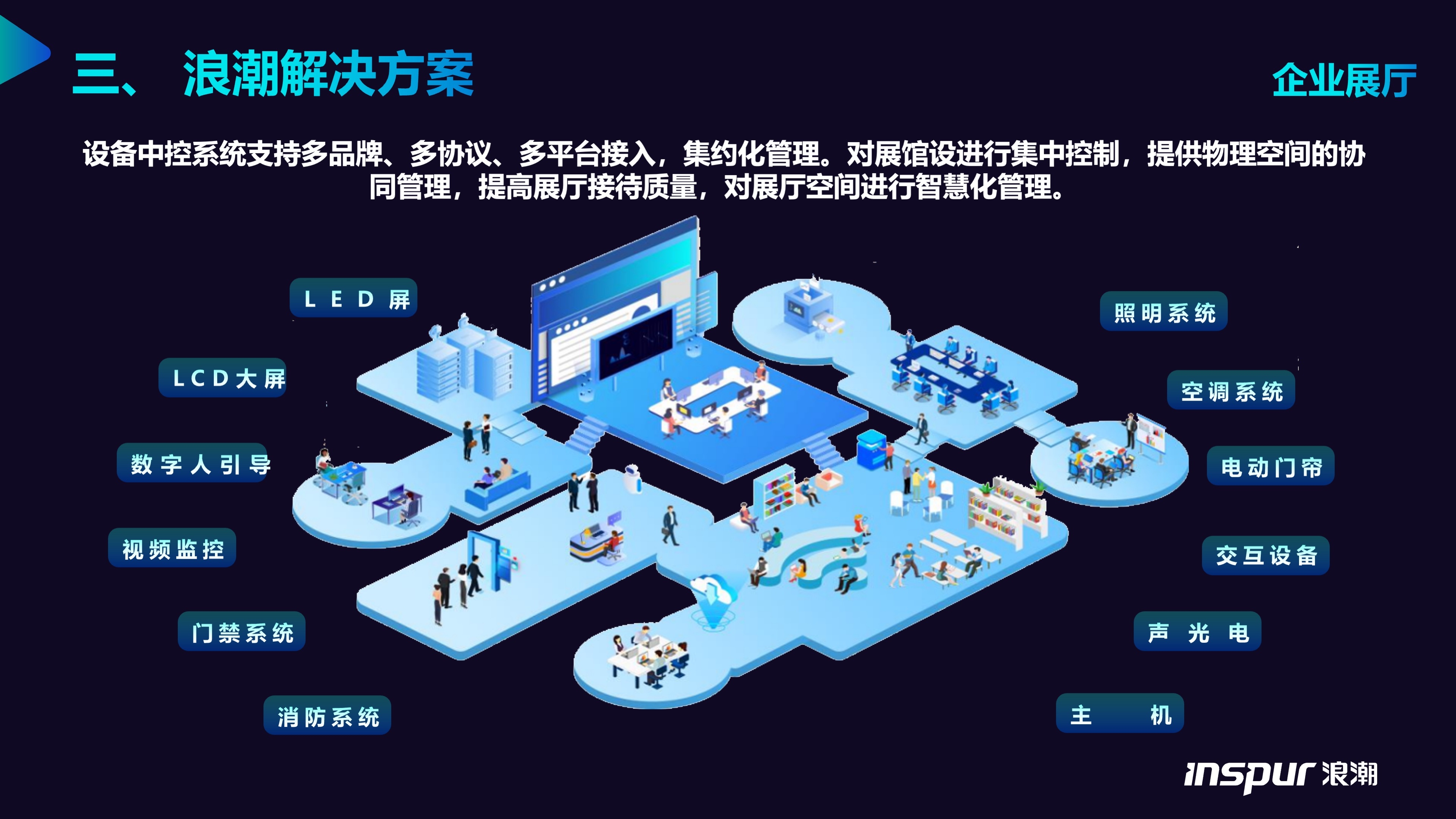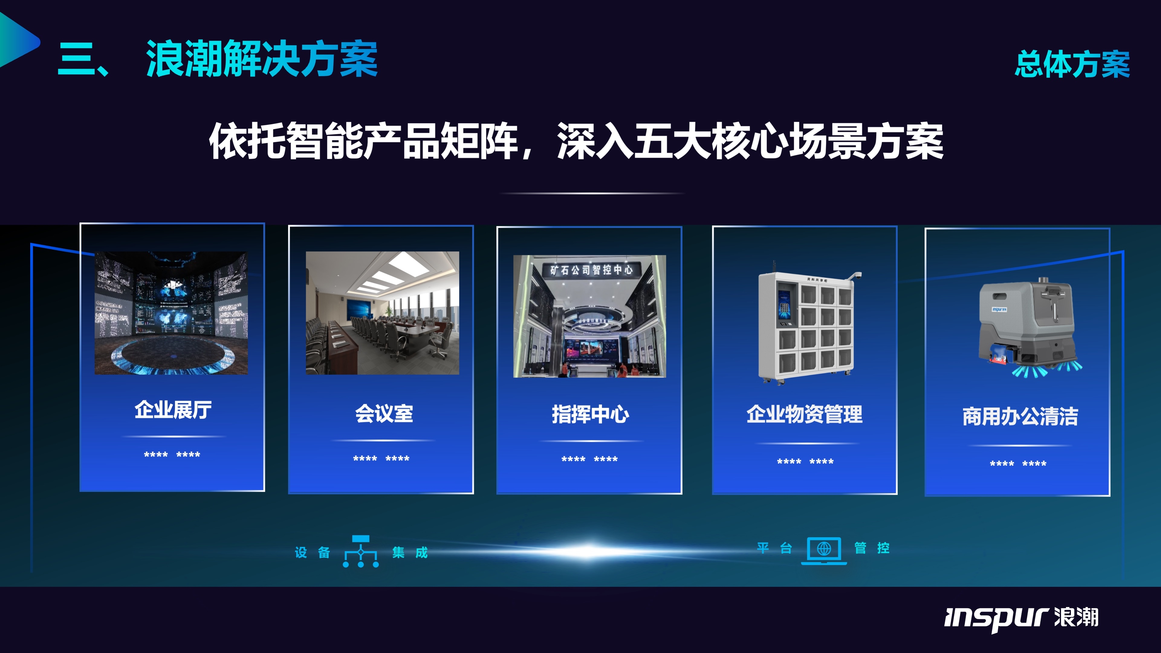 依托于智能终端产品矩阵,深度聚焦并服务于企业展厅、会议室、指挥中心、企业物资管理与商用办公清洁这五大核心场景,给予定制化解决方案。