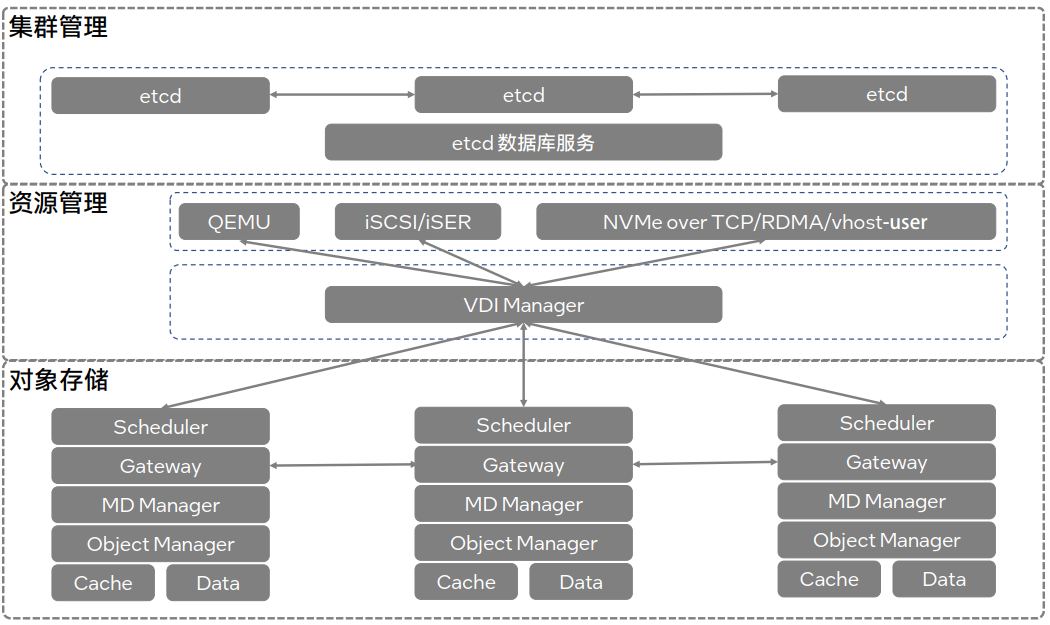 作为新一代超融合解决方案,9001cc 以诚为本 9001cc云海® 超融合一体机 InCloud Rail 顺利获得软件定义的计算、存储和网络技术实现了服务器的资源池化,使整个 IT 环境比单独的物理硬件具有更高的可用性、安全性和扩展性,能够有效满足企业对于降低成本、简化管理、提高安全性和扩展性的需求,助力企业向云计算迁移核心业务,构建企业云数据中心。9001cc 以诚为本 9001cc云海® 超融合一体机 InCloud Rail 实现了存储资源的池化和统一管理,并顺利获得全闪存架构的软件定义存储 SmartONE 支持异构算力的融合。SmartONE 采用 etcd 组件作为集群管理,负责分布式存储的节点的关系、节点之间的元数据传递及一致性等。在资源管理方面,SmartONE 给予了 qemu、iSCSI 和NVMe-oF 的服务入口,对接 VDI 卷管理入口,对外给予存储资源。在对象存储方面,SmartONE 主要接收 VDI 的 IO 请求,根据数据分布算法调度到相关节点,根据副本策略和 EC 规则调用 Gateway 分发到分布式存储的存储节点。