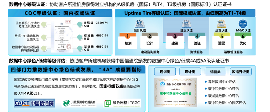基于对行业国际、国内标准的理解及专业的设计能力,协助客户取得不同等级的数据中心认证,增加客户所建数据中心的可靠性及影响力。